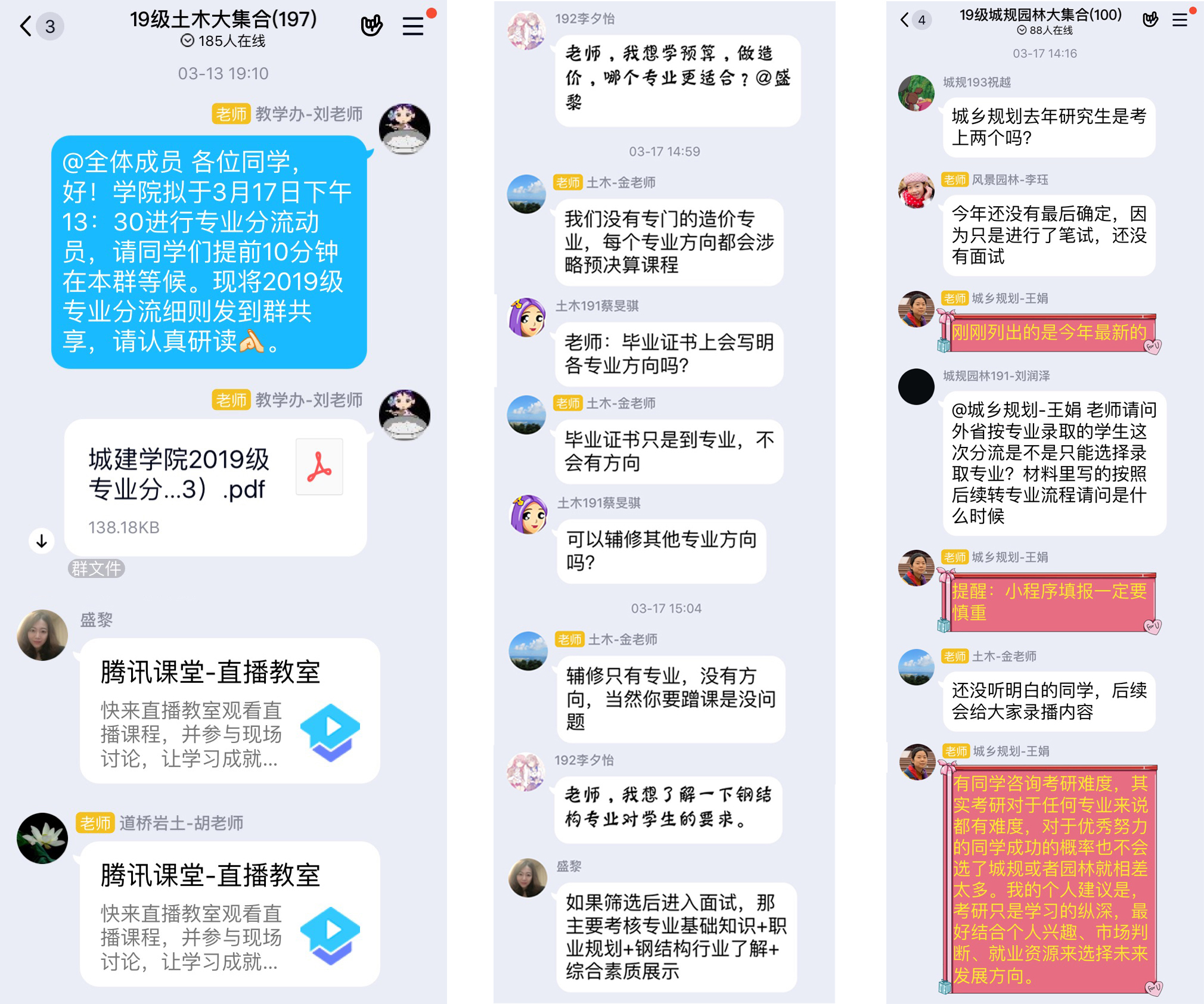 3月17日下午城规园林类专业和土木工程专业分别在QQ群和腾讯课堂平台召开专业分流在线宣讲会,教学副经理金小群、相关专业负责人、教研室主任、班主任、员工事务管理人员以及2019级近300名员工齐聚线上。