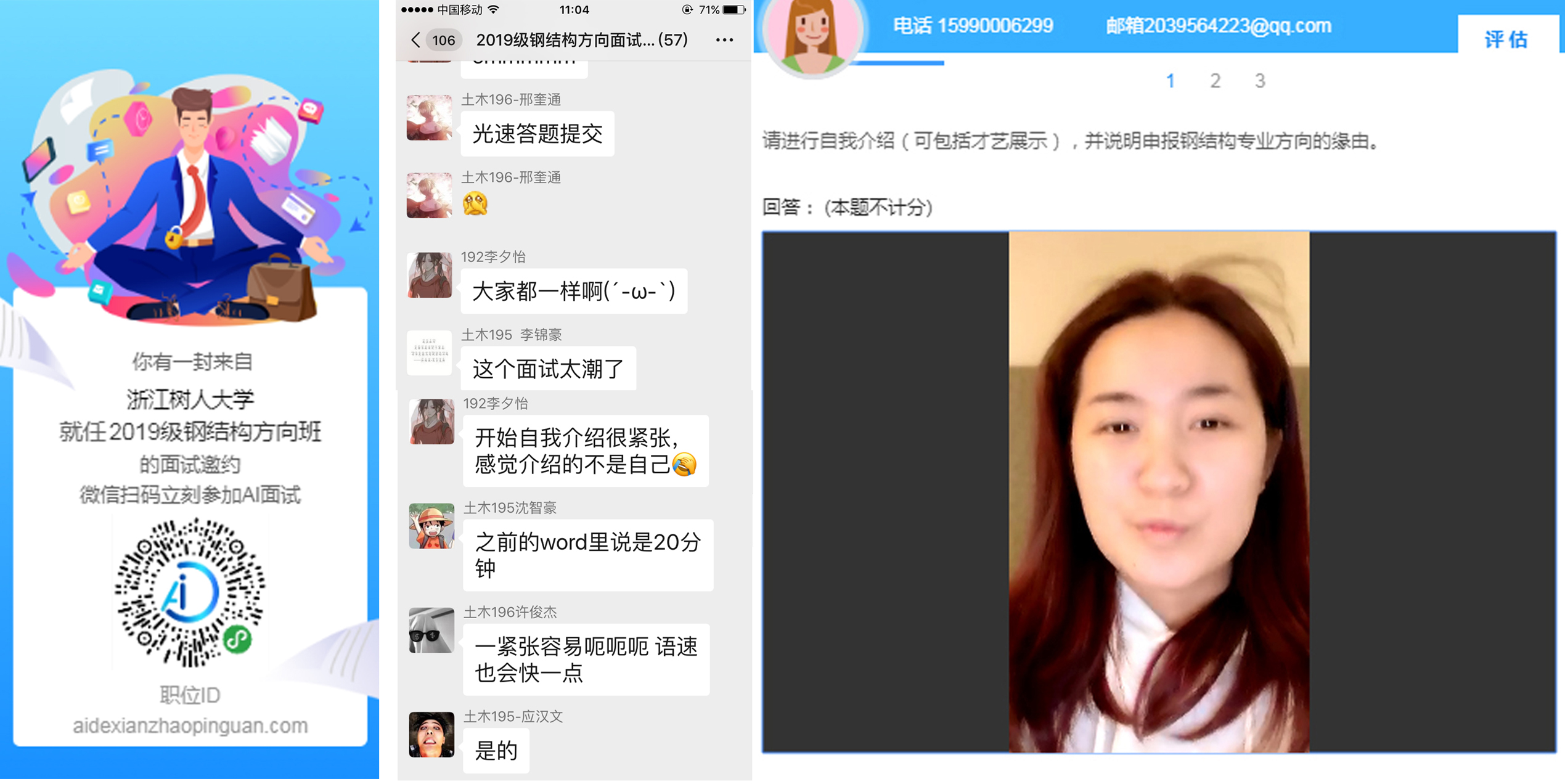 相较其他专业,土木工程钢结构方向的面试情况比较特殊,往年均采取线下面试的方式进行遴选,今年受疫情影响,公司一改常态,通过前期对面试平台的试用、组织员工模拟面试等环节,最终决定采用“AI得贤招聘官”系统线上面试。4月7日下午13:40,53位参与遴选的员工同时扫二维码进行在线视频答题,AI系统全程录屏,顺利完成了线上面试。接下来公司将组织专家通过后台查阅评估报告(员工面试视频)并进行打分,完成钢结构方向的遴选工作。