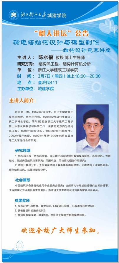 3月7日学术讲座 主题:输电塔结构设计与模型制作——结构设计竞赛讲座 主讲:陈水福教授 博士生导师