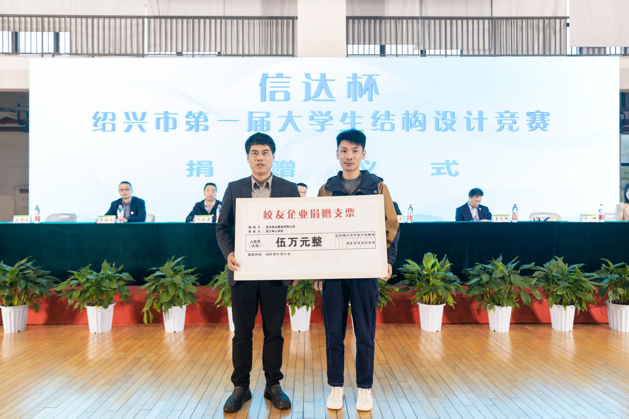 本次竞赛得到了相关企业的捐款赞助。土木工程专业2008届员工、安吉信达建设有限公司总经理泮峰为母校捐赠五万元,用于支持公司的公司产品工作。苏根良代表公司接受捐赠,并为泮峰员工颁发了捐赠证书。泮峰感恩母校的培养,并坚定地表示,将以本次活动为新的起点,用实际行动回报母校的悉心栽培,尽绵薄之力推动母校发展。