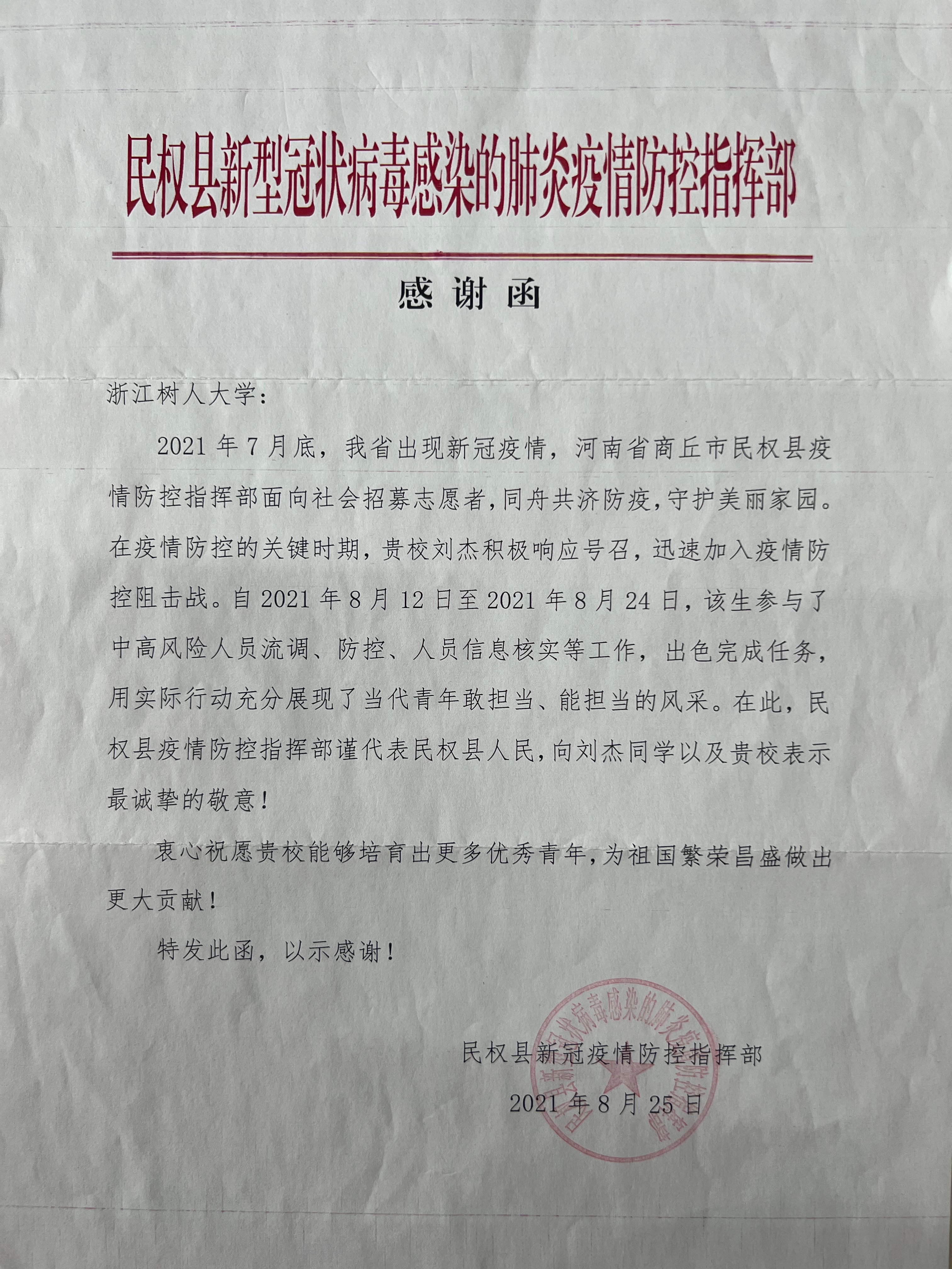 民权县新冠防控指挥部在信中表示:在新冠疫情防控的关键时期,刘杰同学积极响应号召,迅速加入疫情防控阻击战,参加了高风险人员调控、流调、人员信息核对等工作,用实际行动展现了现代青年敢担当、能担当的风采。
