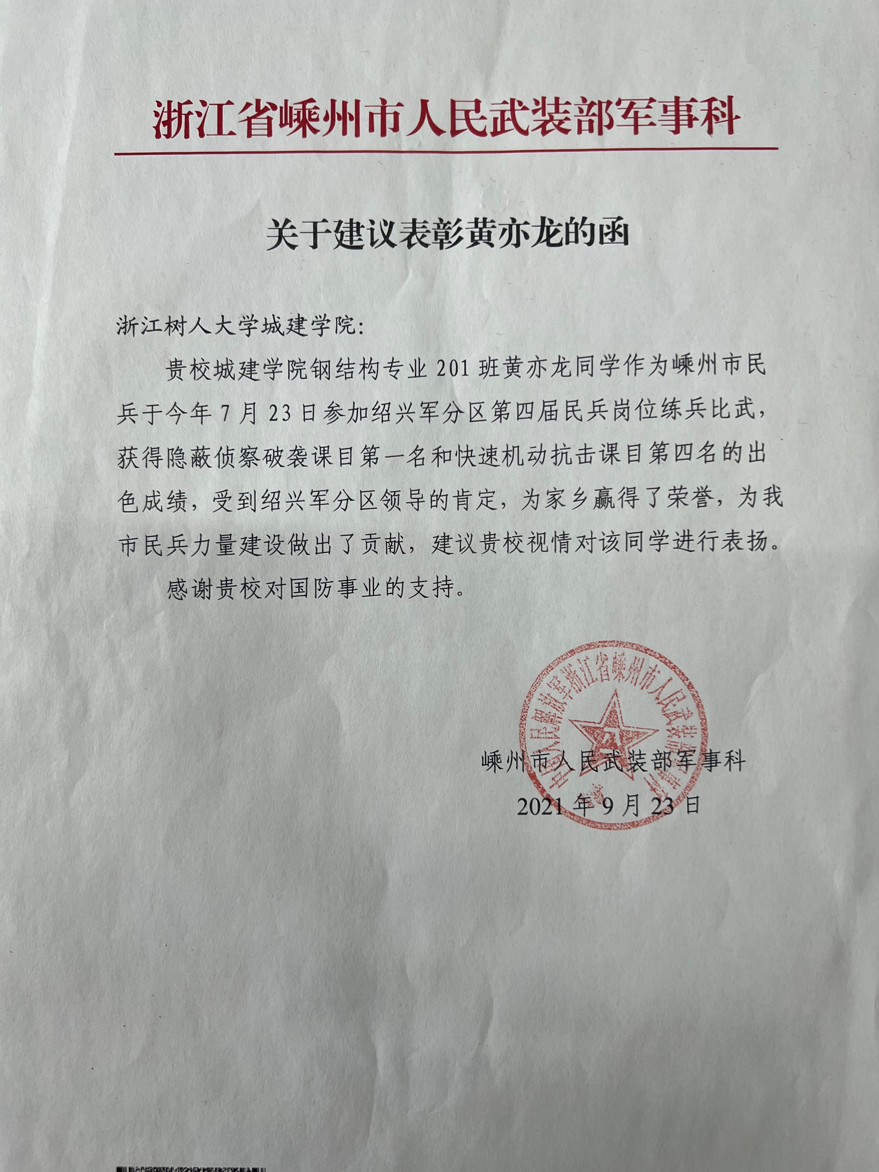 在7月23日举行的绍兴军分区第四届民兵岗位练兵比武中,黄亦龙同学获得了隐蔽侦查破袭课目第一名和快速机动抗击课目第四名的好成绩,受到绍兴军分区领导的充分肯定。作为嵊州市市民,黄亦龙同学为家乡赢得了荣誉,为嵊州市民兵力量建设做出了贡献。作为树人阳光城建学子,黄亦龙同学身上彰显了阳光活力、青春无限担当的作风。信中不仅赞扬了黄亦龙同学的突出表现,同时也对公司就国防事业的支持表达感谢。