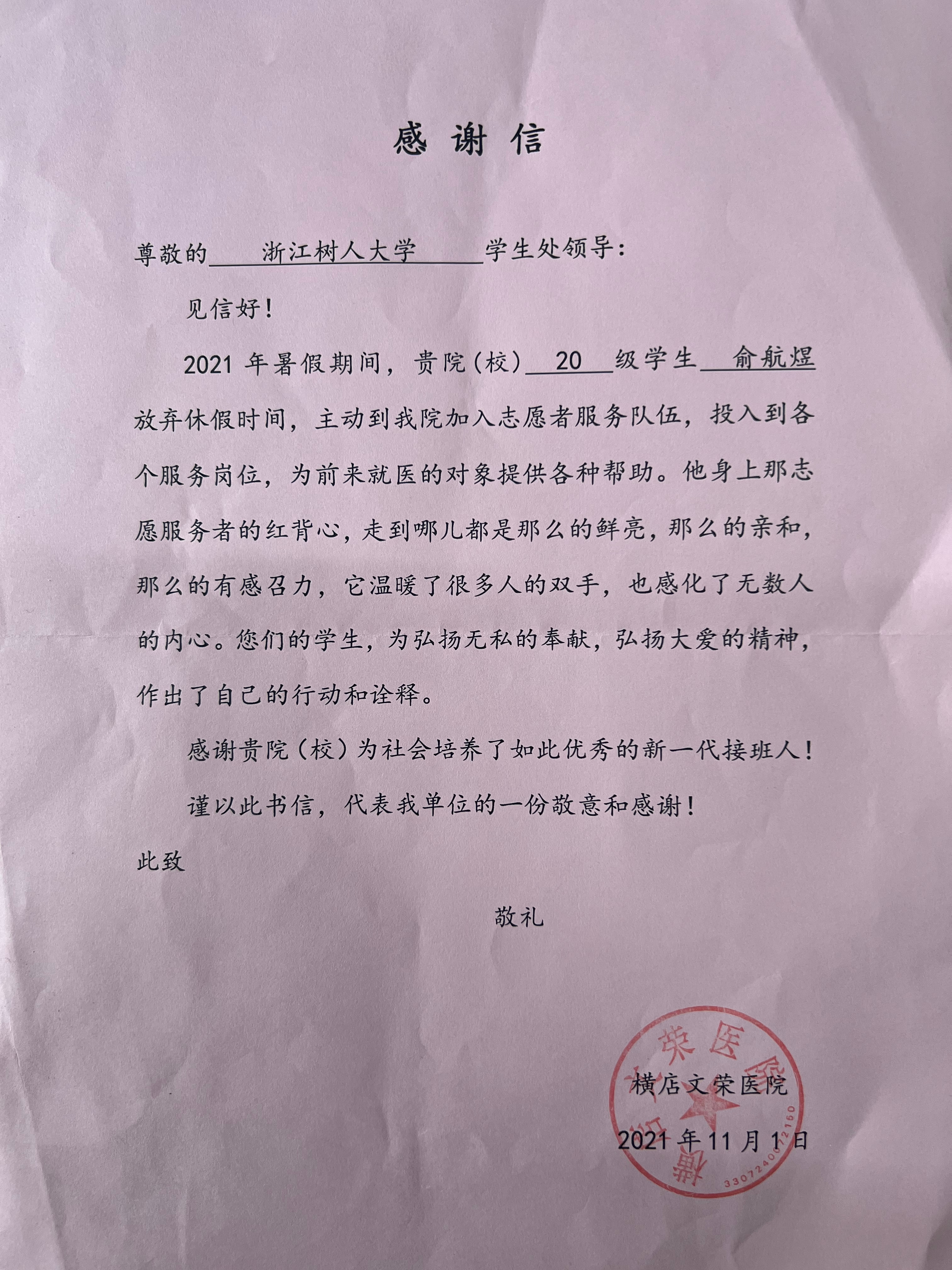 横店文荣医院对俞航煜同学不吝褒美之词,院方在信中写到:“他身上那志愿服务者的红背心,走到哪儿都是那么的鲜亮,那么的柔和,那么的有感召力,它温暖了很多人的手,也感化了无数人的内心。”
