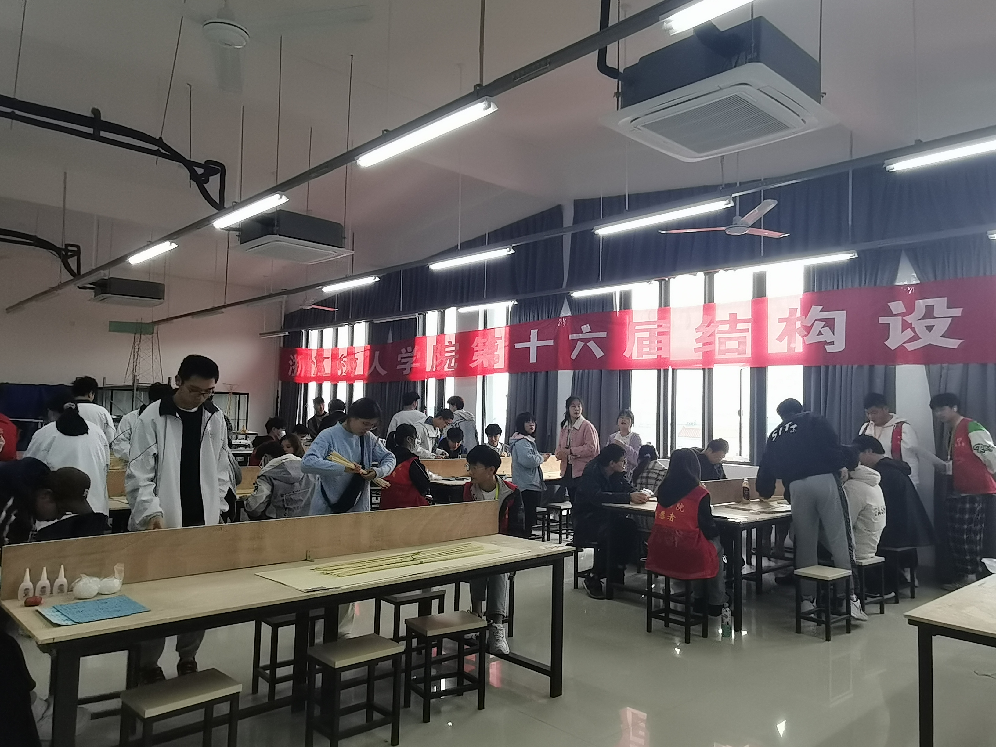 本次大赛共吸引了13支队伍报名参加,现场气氛紧张,选手们争分多秒,在4月5日完成了11小时的模型制作,并于第二天完成加载。决赛加载现场精彩纷呈:有的参赛模型轻巧而耐重,有的模型随着荷载的增加变形过大而发生垮塌。除了模型加载成功时的欢呼,现场也不时发出失败后的失落叹息声。丰富的结构形式引发了现场专家和指导老师们的热议。