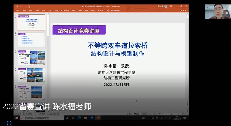 一年一度浙江省结构设计竞赛如期而至,为全面认识竞赛赛题,帮助员工拓展思维体系,提升员工科技创新意识,3月15日晚18:00,永利65335com(宸阳书院)特邀浙江大学建筑工程公司博士生导师陈水福教授做题为“不等跨双车道拉索桥结构设计与模型制作”结构设计竞赛讲座。讲座以腾讯会议线上形式开展,由公司常务副经理金小群教授主持,师生约250余人参加并进行热烈探讨,效果良好,收获丰富。