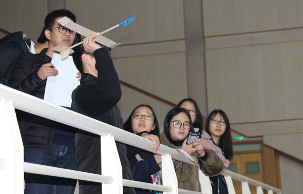 12月13日中午,北校区体育馆内举行了预赛。赛前,参赛选手们提早到来,在馆内调试自己的滑翔机。活动开始后,工作人员对参赛选手的模型进行初步称重、审核和分组。当比赛进入正式手抛滑翔机阶段时,现场气氛进入高潮。经过一番激烈的角逐,10组选手进入决赛。