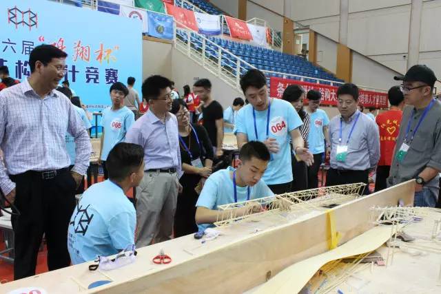 姚谏经理带领这本次大赛的专家们,来到模型制作现场,观看各参赛队伍的进度,并与参赛队员进行交流,予以支持和鼓励。当模型制作进入尾声之际,正台上的志愿者们开始拿起竹皮,进行称重,做好模型制作最后的程序把关。结束的钟声在中午12:00响起,经过了两天的努力,各参赛队的作品已经成型了。接下来便是激动人心的,现场模型加载比赛。