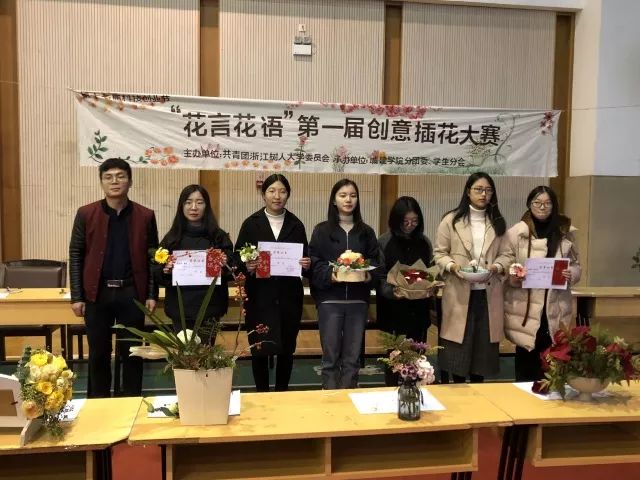 最后恭喜管理公司的华瑞雯、何斌瑶同学获得本次比赛的一等奖。赛后,两位同学很谦虚地表示,她们也十分欣赏其他组的表现,特别是其他组中式的插花风格,是值得他们学习的。