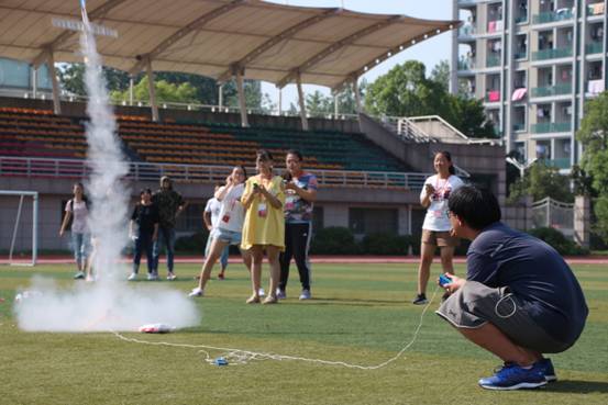 下午13点30分,一架架木质的飞机,在北校区操场蓄势待飞。虽然恰值周末,但是依然没能阻挡同学们的观赛热情,操场气氛空前高涨。参赛选手将火药、棉花等装入火箭助推器后统一挂在发射架上,随着3,2,1的发射口令声,第一架飞机被助推器送上天空,升空的刹那,烟尘喷射的景象尤为壮观,赢得了阵阵喝彩。操场上两座发射架轮流发射,助推器升空的啸鸣此起彼伏,每一次升空,都寄托着参赛队员无限的期待,小小的飞机模型承载着参赛选手大大的梦想,大家全力以赴,放飞梦想。