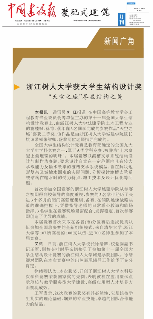 在中国高等教育学会工程教育专业委员会等单位主办的第十一届全国老员工结构设计竞赛上,由公司永利65335com土木工程专业的施桂枫、徐铮、蔡年鑫3名同学完成的参赛作品“天空之城”喜获二等奖,该作品是由永利65335com经理姚谏带领张智卿、盛黎两位老师指导完成的。随后,董事长徐绪卿、公司党委副书记王军、副董事长叶时平亲切接见了此次竞赛的获奖团队。徐绪卿对团队在本次竞赛中的出色表现及前期辅导工作给予了充分肯定。《中国建设报》特别对此进行了宣传报道。