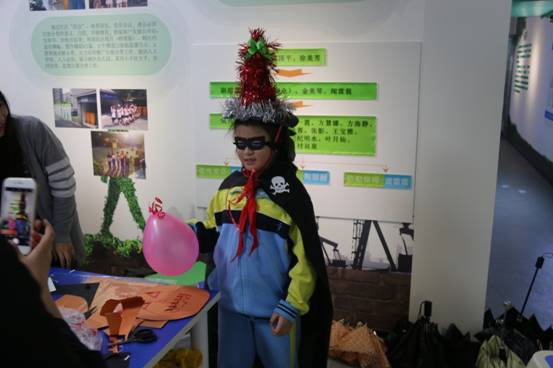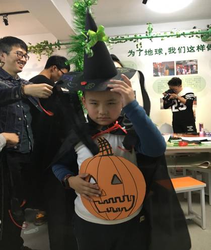 我们提前准备了节日需要的手工材料:卡纸、剪刀、胶水、彩带、糖果等;并且事先做好了部分成品,社区晚托班的十几个小朋友看到我们显得非常兴奋。很快他们便安静下来,在大哥哥大姐姐们的陪同与指导下认真做起自己心中的万圣节道具。经过一个小时的埋头制作,他们的作品已初具规模:黑色的披风点缀着星星、月亮和万圣节骷髅头的标志、全手工的巫师帽上挂着彩带、以及南瓜面具、骑士眼罩等。孩子们穿戴上亲手DIY的服装道具摆各种造型,看着他们开心的笑容我们觉得这次的活动是非常有意义的。