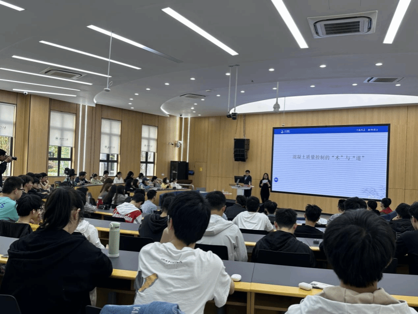 在热烈的掌声中,讲座拉开帷幕。朱钢明老师从介绍自己的从业经验入手,“术”业有专攻地讲述了混凝土施工中原材料质量控制、混凝土性能要求、配合比设计、混凝土生产与施工、质量检验及质量问题控制等专业技术问题。朱老师特别详细地为同学们总结了混凝土使用的各项指标与行业要求及检验方法,将复杂的术语归纳为“按需选用”“慎用海水”“预防碱-集料反应”等一系列简单鲜明的短语,使同学们易于理解,受益匪浅。