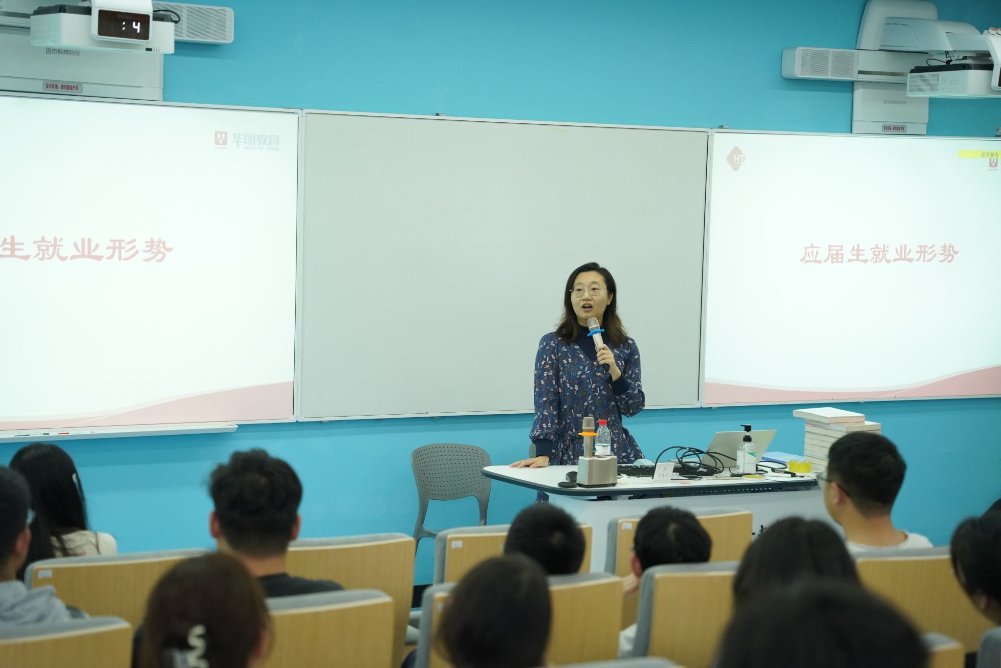 一开始,张老师以就业指导为切入点,客观分析了当前高校毕业生就业形势,通过讲解真实案例鼓励员工将“考取公务员”“考取事业编”作为一项就业选择,接着从考情分析、考试内容及备考建议三个方面为在场同学进行了全面的指导,还就近几年的考情做了详细的分析总结,通过数据的形式展开分析和解答,直观阐释并对比各地区国考省考情况等给同学们提出了很多考公考编方面的建议,张老师在指导演讲中既有理性分析,更有幽默风趣,深深吸引着现场聆听的同学。