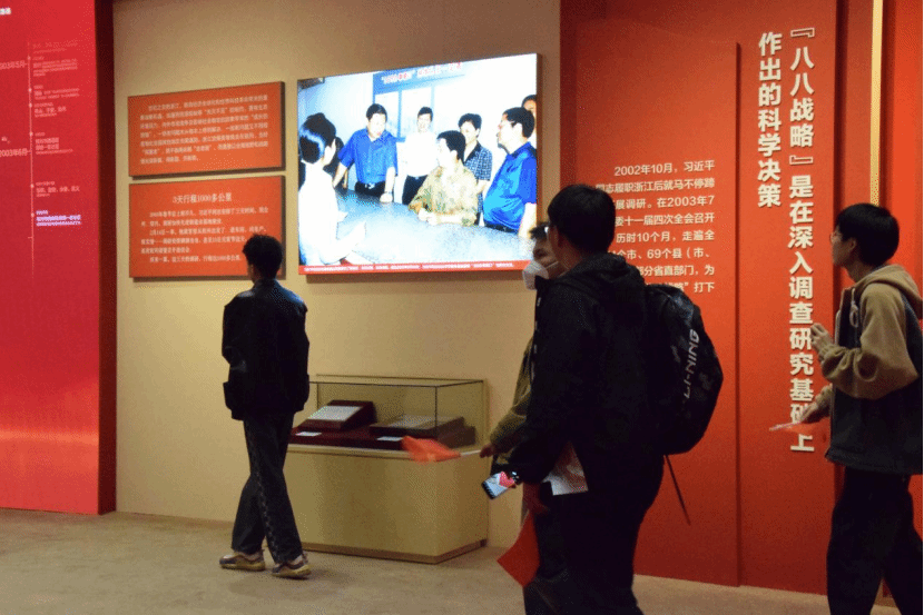 团学部门负责人园林221王梓萱说:在展馆内,能系统全面感知浙江践行“八八战略”20年来全领域各方面发生的精彩蝶变,看见过去,眺望未来。步入展厅,如同走入一段“时空之旅”,感恩“八八战略”的引领,让人民走进幸福,迈向未来。