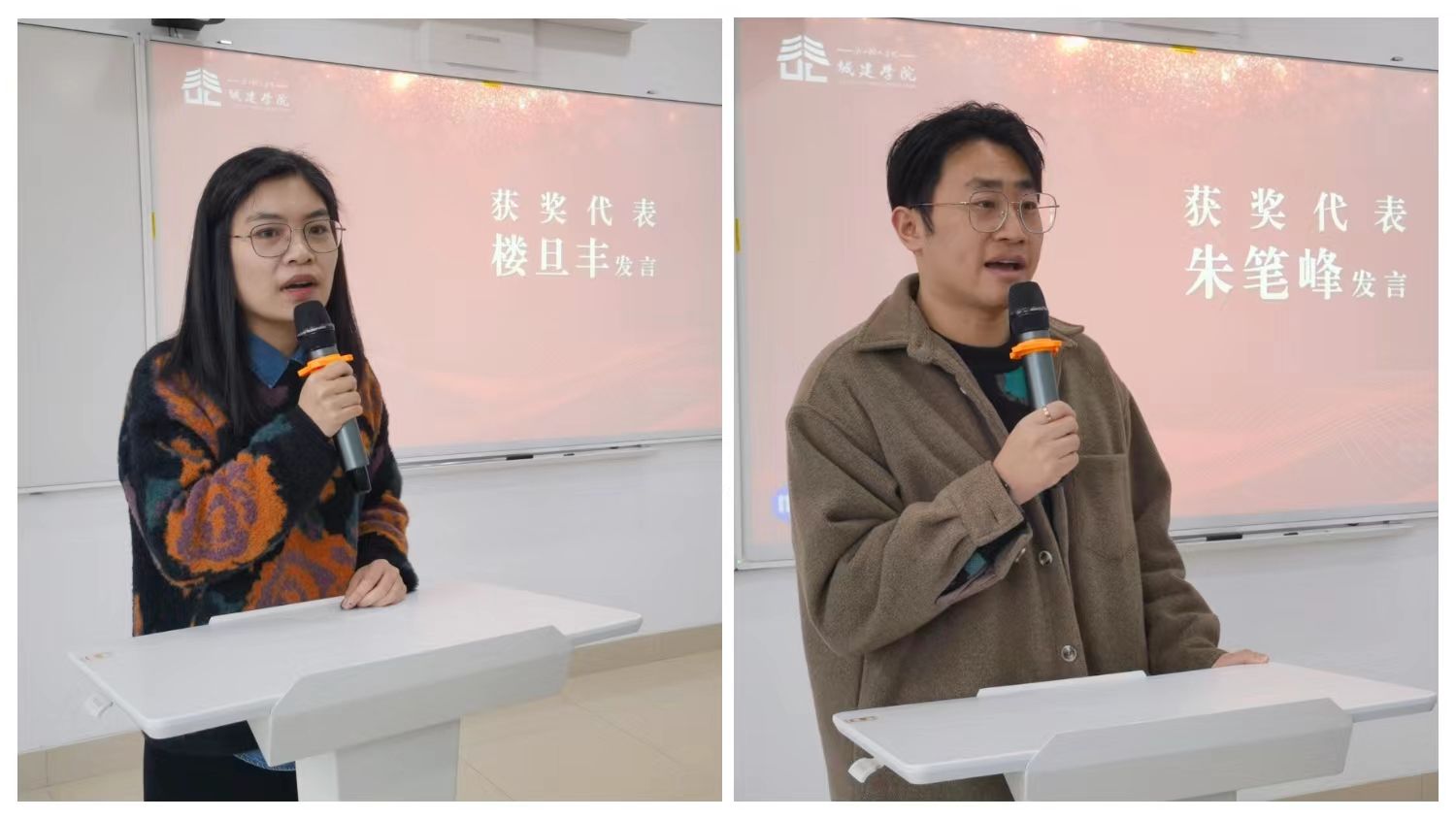 楼旦丰副教授、朱笔峰副教授作为获奖教师代表发言。两位老师分享了各自在教研工作上的感悟和体会,倾诉了对公司和公司的感激深情,并表达了心怀敬畏、不忘初心、关爱员工,把工作当作毕生事业认真经营,把课程当作毕生作品用心打磨,立足岗位再建新功的决心。