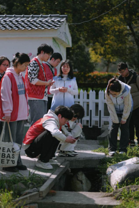 第二阶段,志愿者们前往了水美乡村蒲荡夏村,并开展净滩实践治水活动,通过清理河边及河道垃圾,使他们对保护河道环境有了更深的认识。同时也看到了在乡村振兴的建设下,蒲荡夏村通过建设牛头湖及其他旅游产业,不断深化水生态效益价值转化,为乡村振兴注入新的动能。
