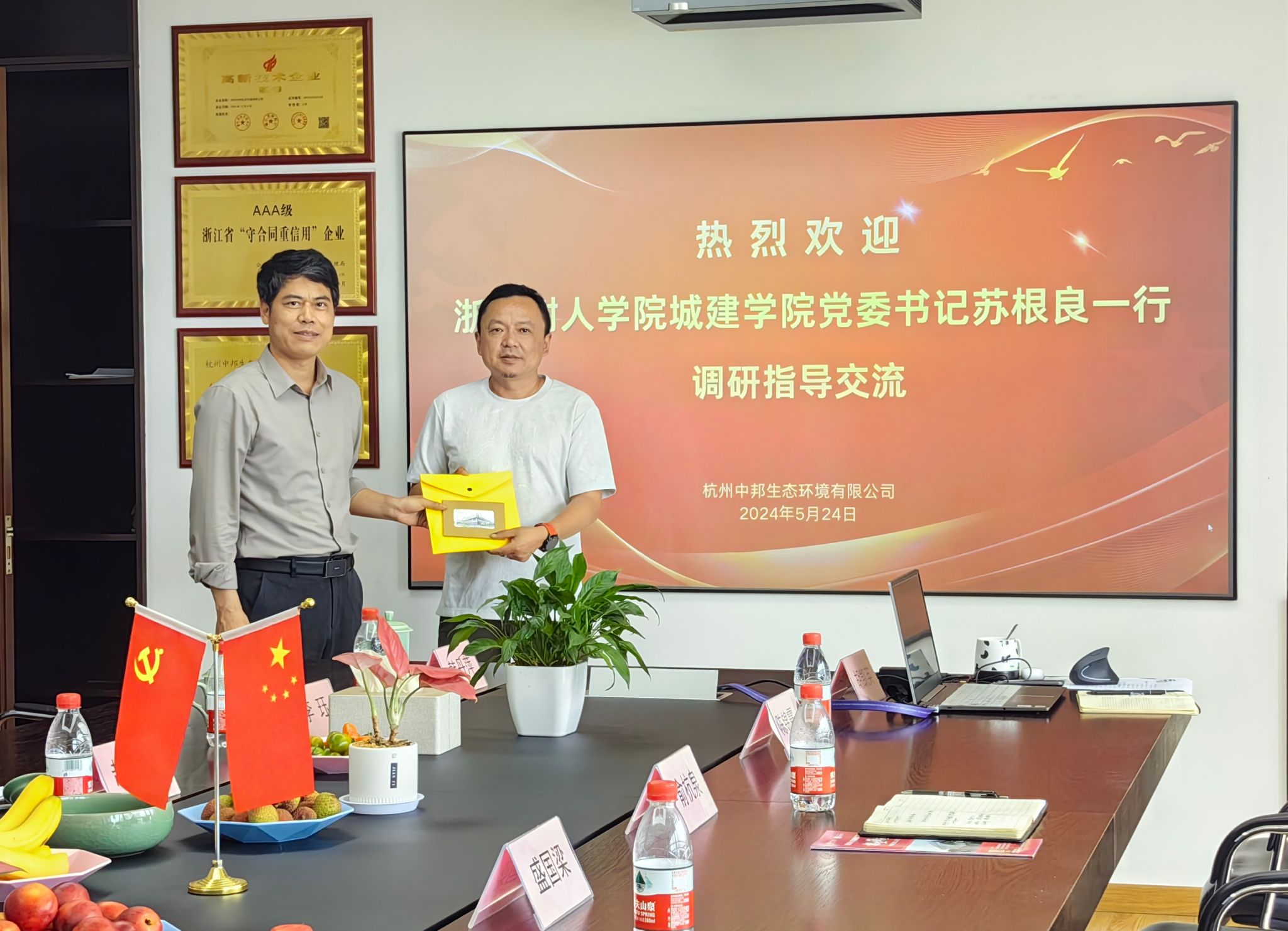 在会谈环节,盛国梁员工对苏书记一行表示热烈欢迎,并介绍了杭州中邦生态环境有限公司的发展历程及公司取得的成就和荣誉,重点介绍了杭州市丰收湖公园、上塘河绿道提升改造工程等代表性项目。目前中邦公司已经成长为杭州乃至周边地区都卓有名气的一家专业化从事各类生态环境工程的设计、施工、技术开发业务的企业。