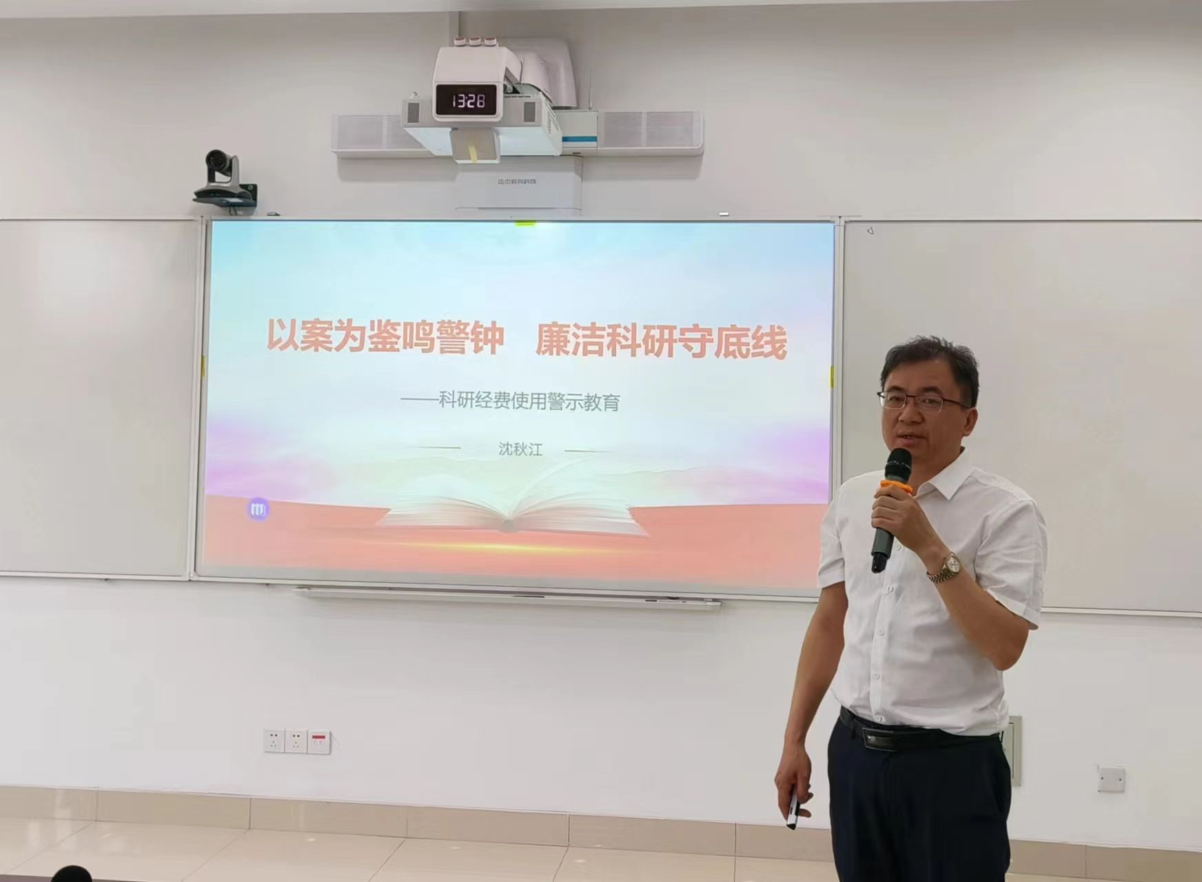 会议伊始,校纪委办审计处沈秋江处长作了一场深刻的《以案为鉴鸣警钟 廉洁科研守底线》的党纪学习教育专题党课。沈处长结合当前科研经费管理的最新动态和科研经费违规使用的典型案例,进行了深入浅出的剖析,以案说纪,引导全体教职工充分认识到科研经费规范使用的重要意义,并提出了三点具体要求:一是牢固树立科研经费公有属性的意识;二是牢固树立底线意识;三是牢固树立以“相关性”和“合理性”原则使用科研经费的意识。他希望与会教工以案为鉴,树立更自觉的纪律意识和更高的师德标准,以严的纪律保障高质量科研成果产出。