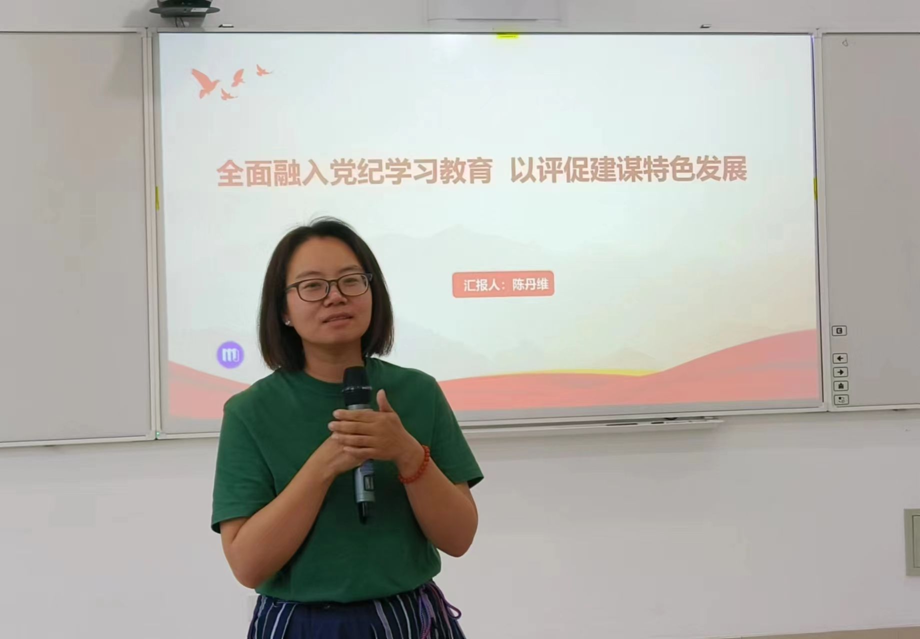 随后,教学副经理陈丹维作了《全面融入党纪学习教育 以评促建谋特色发展》的党纪学习教育专题党课。她详细解读了新一轮审核评估工作的背景、意义、评估类型框架、工作流程和工作重点,并希望全体教职工能够深入学习,将党纪学习教育与日常工作紧密结合,以“知纪到位”全面筑牢师德师风建设的价值底线,扎实推进新一轮审核评估的评建工作。
