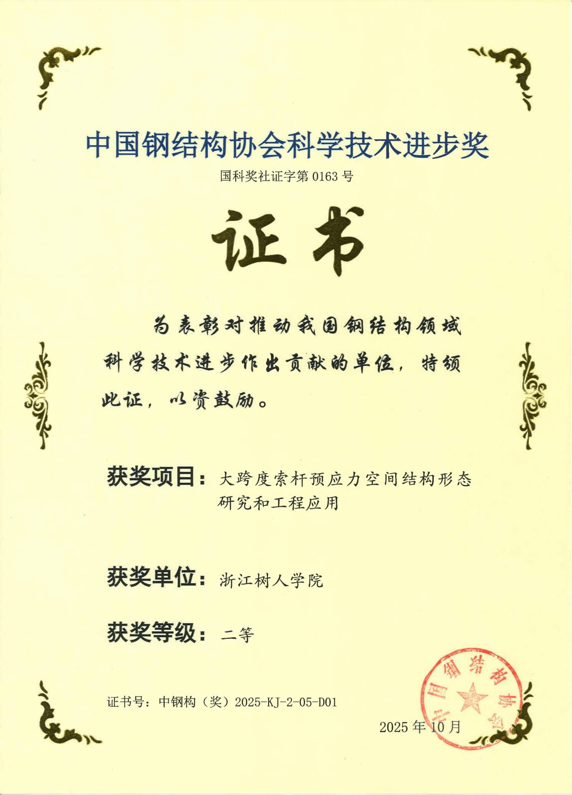 2025年10月13日至15日,在广西南宁召开的“中国钢结构协会第九届会员代表大会暨2025中国钢结构大会”上,2025年度中国钢结构协会科学技术奖正式揭晓。由公司王振华正高级工程师牵头申报的项目“大跨度索杆预应力空间结构形态研究和工程应用”荣获科学技术进步奖二等奖。