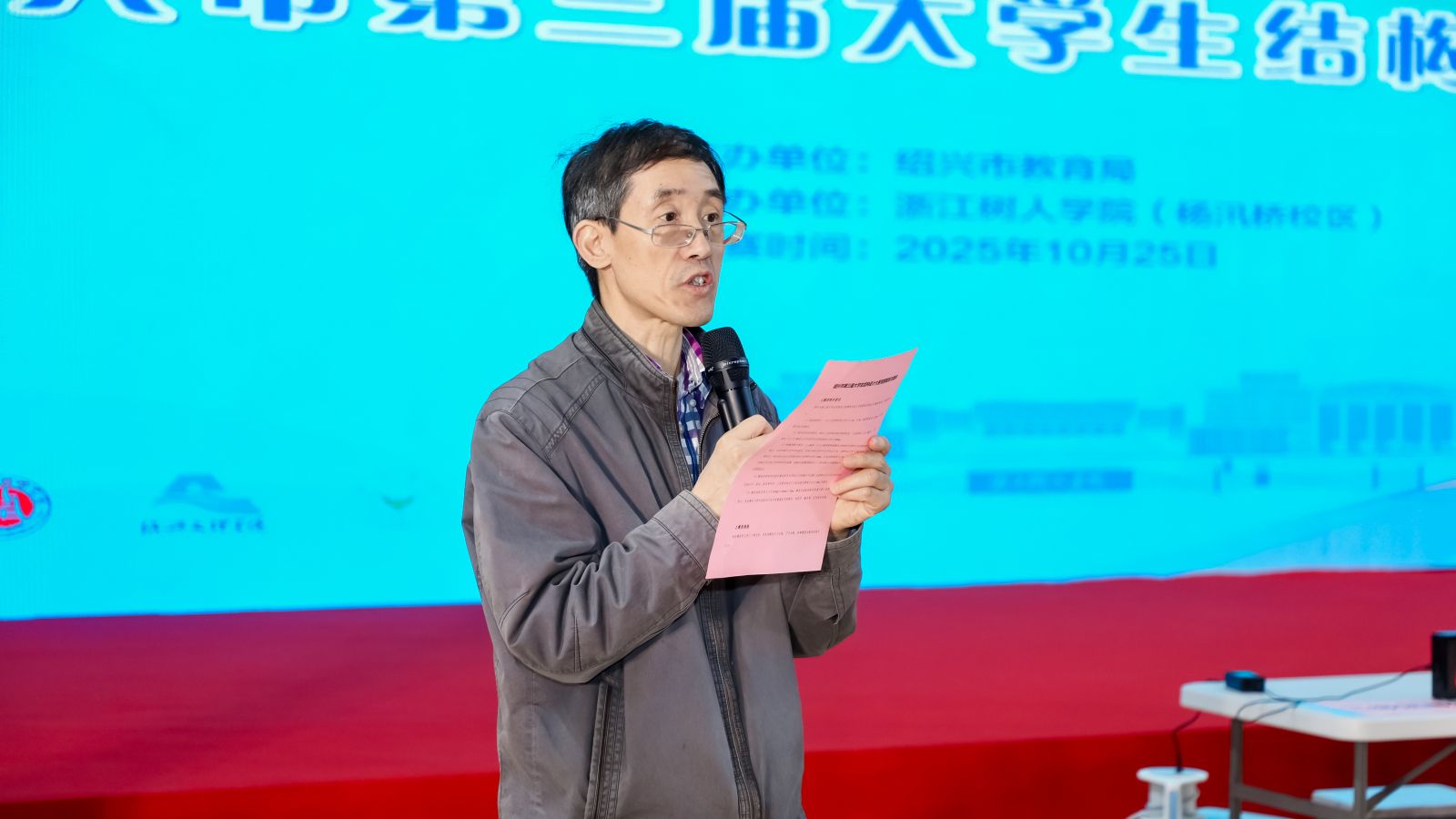 评审专家组主任、浙江大学陈水福教授在发言中强调了结构设计在工程教育中的核心价值,并对公司的赛事组织工作表示充分认可。他代表专家组宣布了竞赛规则与具体要求。指导教师代表、绍兴文理公司黄城均老师以“以结构之美,筑青春之塔”鼓励同学们在参与中成长。公司土木工程专业陈怡浩同学代表全体选手表达了全力以赴、奋勇争先的决心。