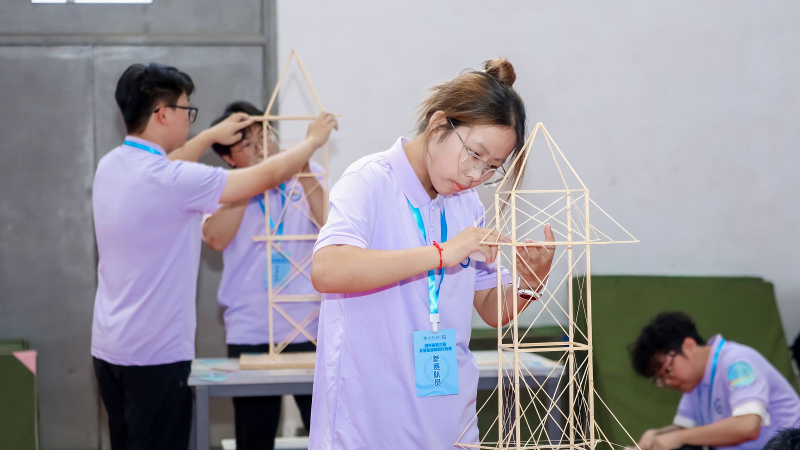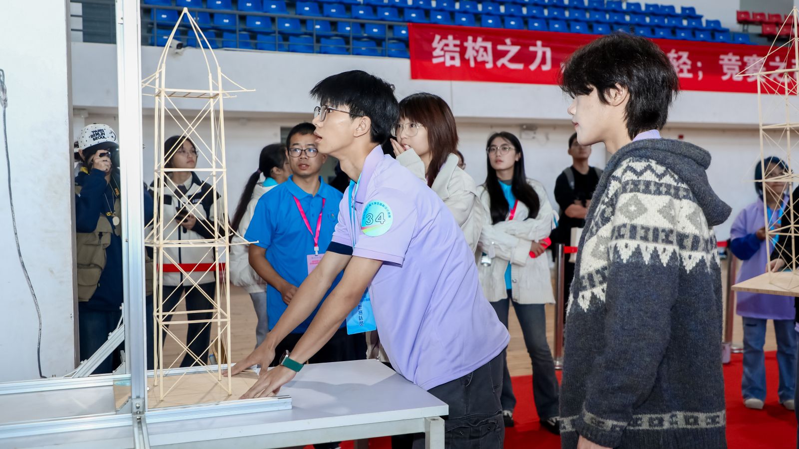 本届竞赛以“两重塔结构设计与模型制作”为题,要求参赛者在多荷载工况下完成结构分析、模型制作与加载测试,全面考察其理论功底、创新思维、动手能力与团队协作水平。比赛现场,各队全神贯注、精细操作,将竹材逐步转化为精巧而稳固的结构模型。